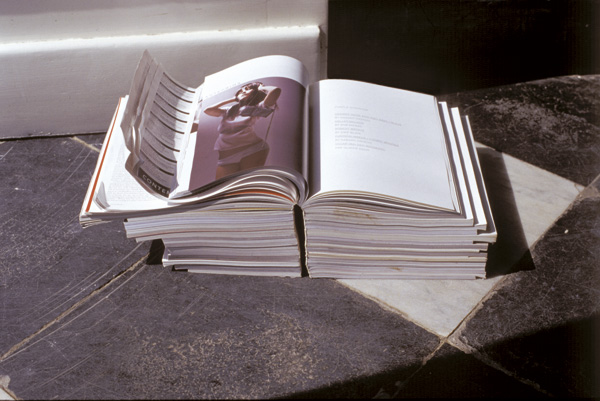 | First shown in the exhibition “Magasin” held at Marres, center for contemporary art, Maastricht, from the 9th of May till the 8th. of June 2003. All major art and culture magazines from one month without covers, bound to one big book and used as a door-stopper for the Gallerie’s back-garden door. (First edition of three with white/transparent spine, courtesy Marres, Maastricht and Collecion Jumex, Mexico) |